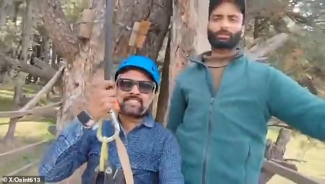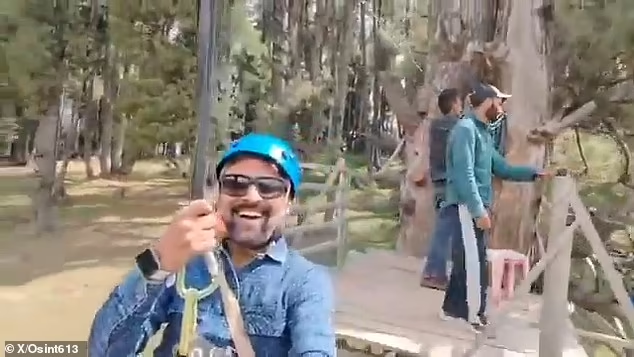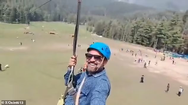 印度一游客在山谷上空开心滑索, 但下面正在恐袭有26人死亡